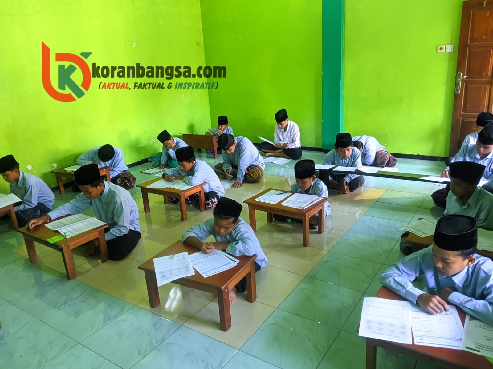 Tampak para santri sedang melaksanakan ujian dengan penuh kesungguhan. Mereka duduk bersila di lantai, masing-masing tertata rapi dan berjajar dengan jarak tertentu. Posisi duduk yang sederhana namun tertib ini mencerminkan tradisi khas madrasah diniyyah dan pesantren, di mana nilai kedisiplinan, kesederhanaan, serta adab dalam menuntut ilmu menjadi bagian yang tidak terpisahkan dari proses pendidikan. Para santri mengenakan seragam bernuansa seragam dan peci hitam, yang semakin menguatkan identitas mereka sebagai pelajar Islam yang menjunjung nilai kesopanan dan ketaatan.
